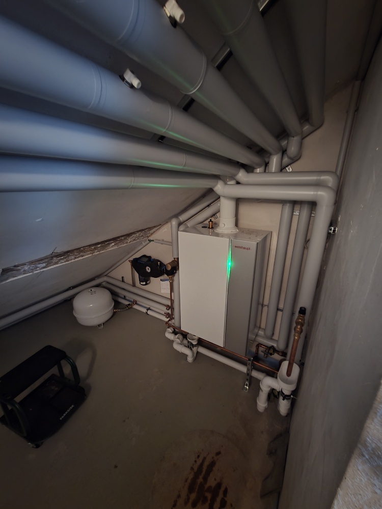 In diesem Projekt wurde ein Reihenendhaus mit ca. 120 m² Wohnfläche erfolgreich von einer Gasheizung auf eine moderne Wärmepumpenanlage umgerüstet. Die bisherige Gasheizung befand sich im Dachgeschoss – die neue Anlage wurde aus Gründen der Platz- und Leitungsoptimierung ebenfalls wieder dort installiert. Trotz der kompakten Platzverhältnisse konnten alle erforderlichen Komponenten problemlos untergebracht werden.